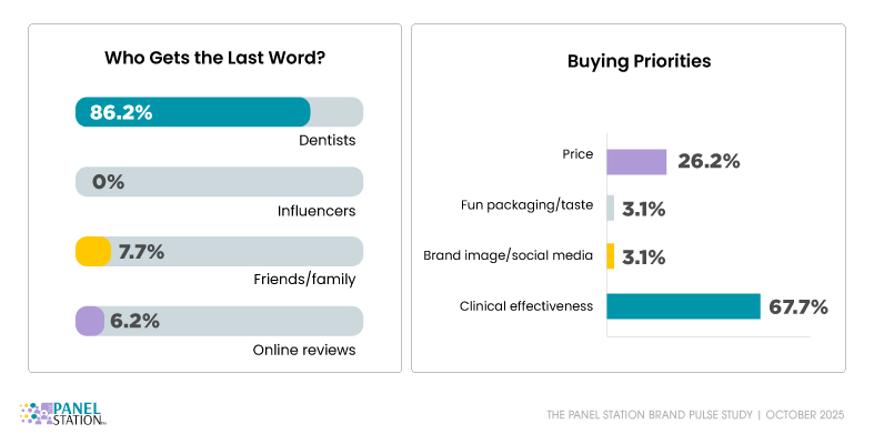 If you think influencers hold all the power — not here. An overwhelming 86.2% said they trust dentists the most, and literally 0% said influencers.