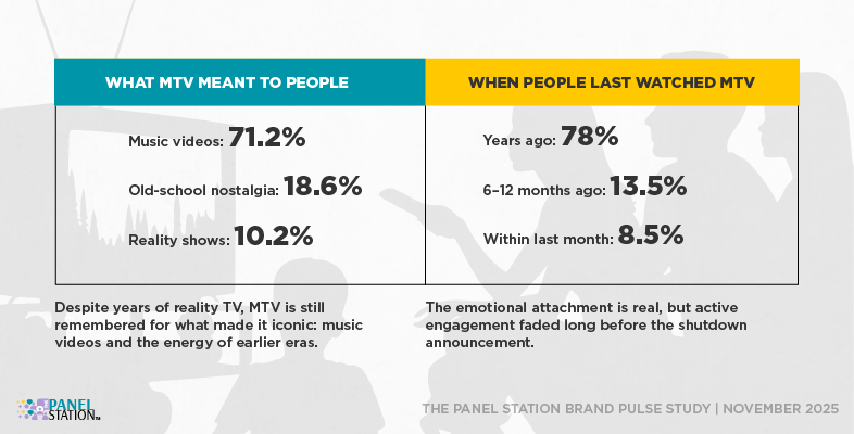 Yet, when respondents discovered the news through the survey, nostalgia surfaced. When people think of MTV, the strongest association remains simple and pure – Music videos.
